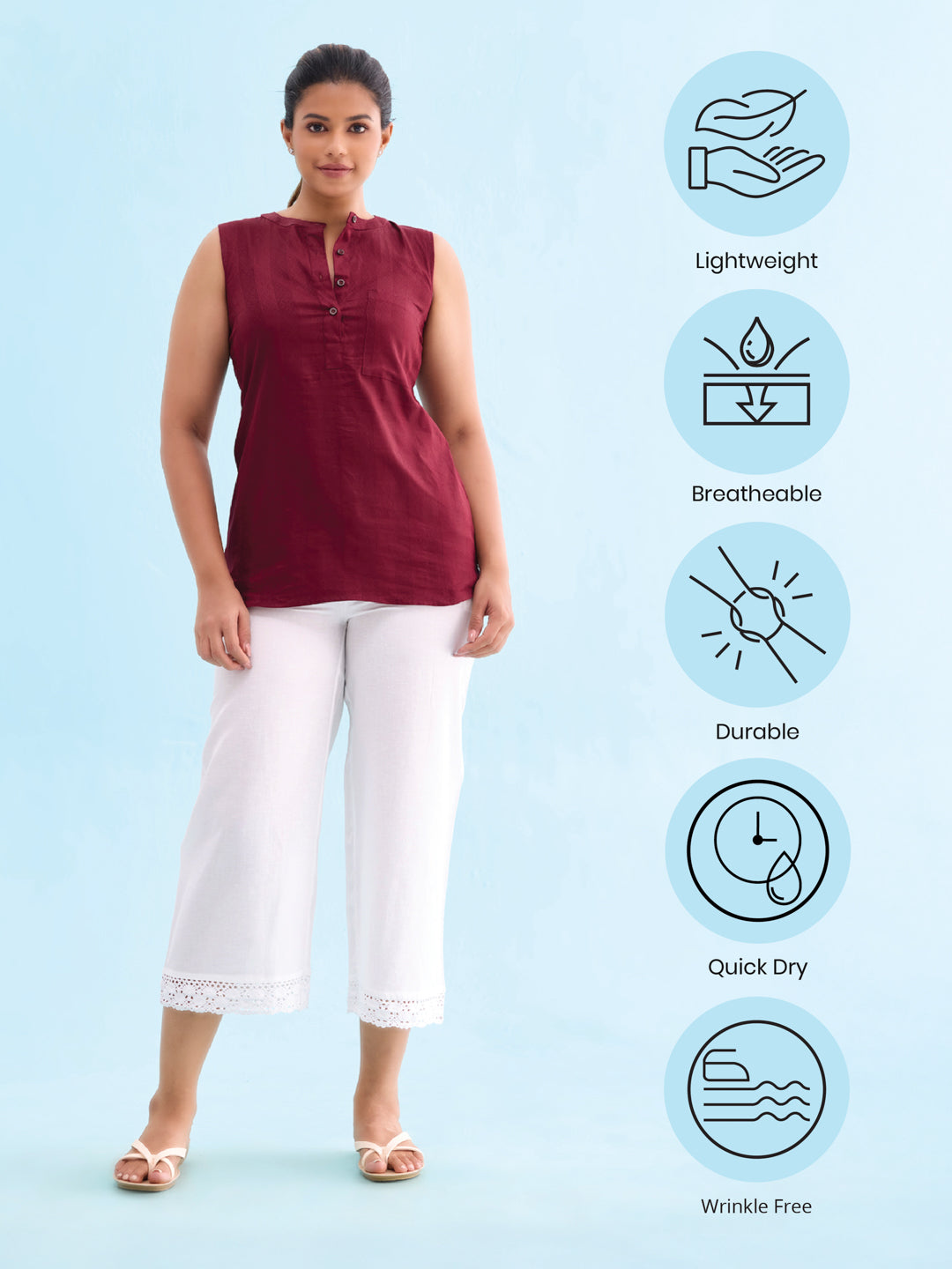 Be it a kurti or a top, these White Linen Wide Pant comes with an elasticised waistband it fits the bill for every look. Made from Linen & Viscose, it has side pocket & relaxed fit with slip on closure.