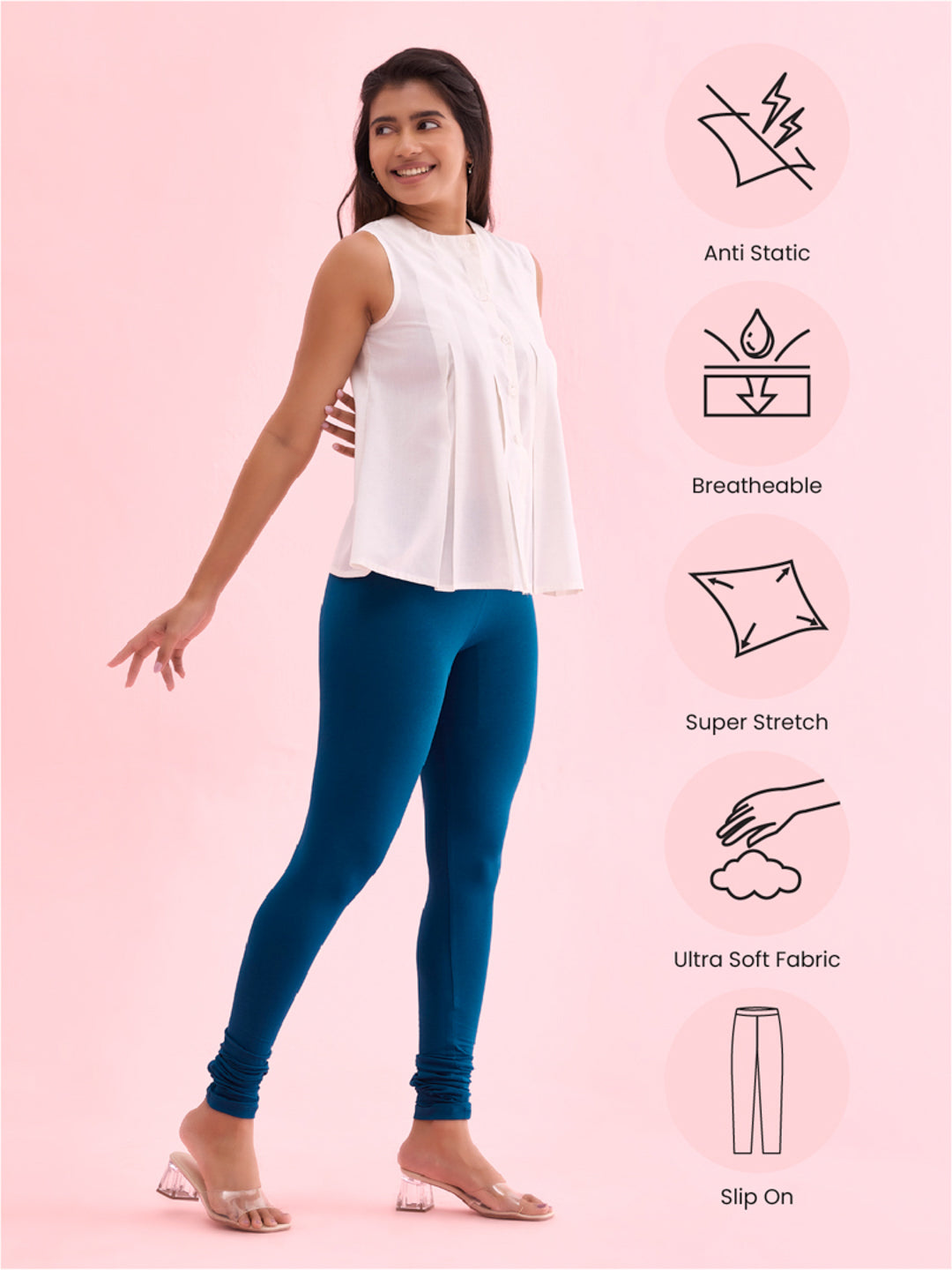 Go chic with a pair of Turquoise Blue Solid Churidar Leggings. Made from high quality cotton, it has a elasticised waistband & gathers at the hemline.