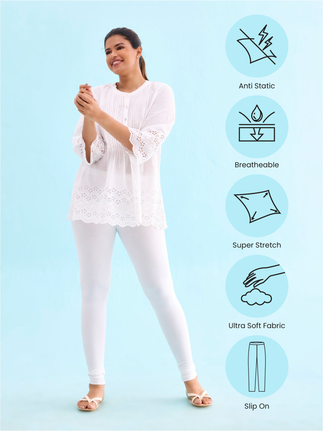 Go chic with a pair of White Solid Churidar Leggings. Made from high quality cotton, it has a elasticised waistband & gathers at the hemline.