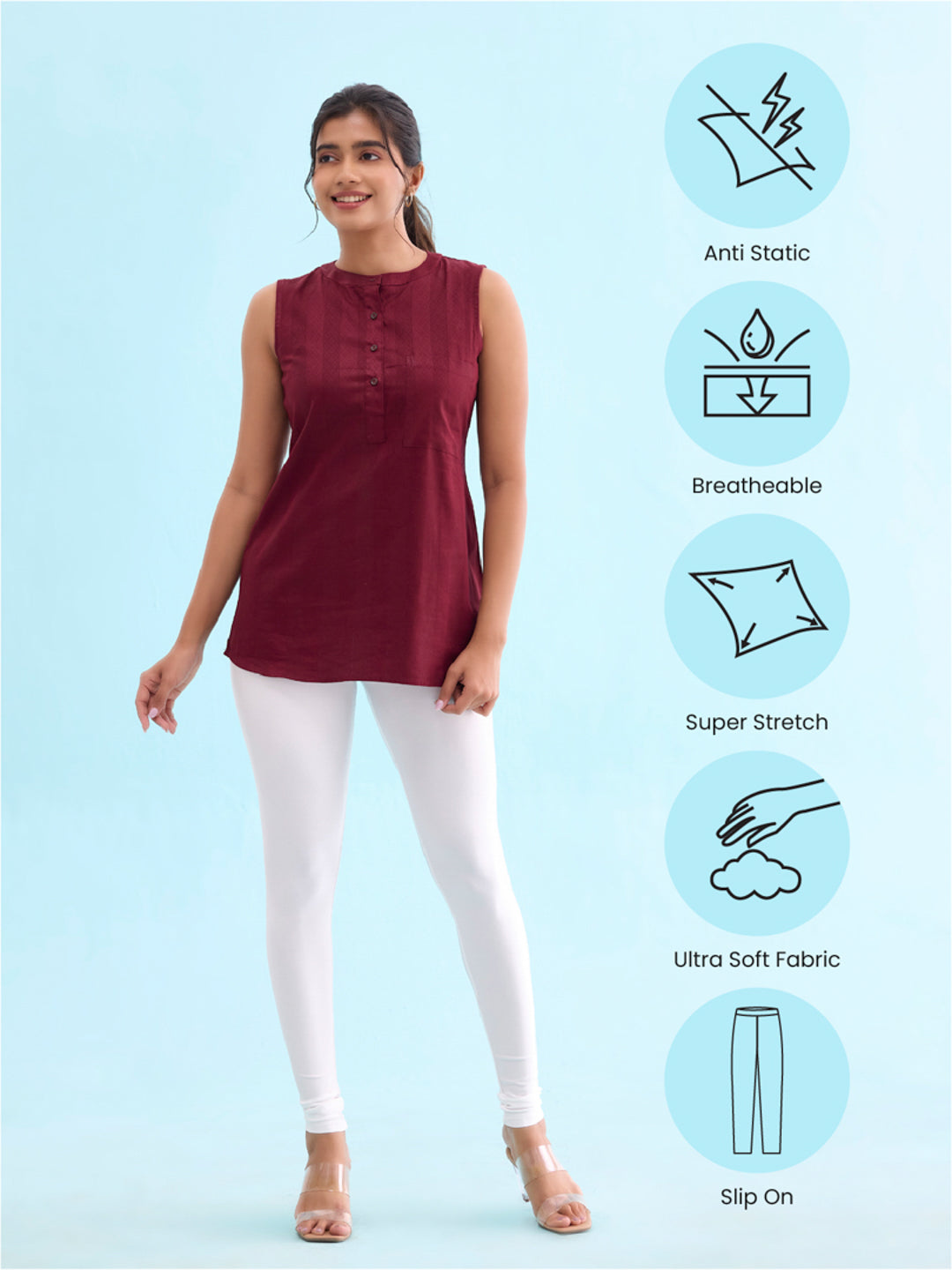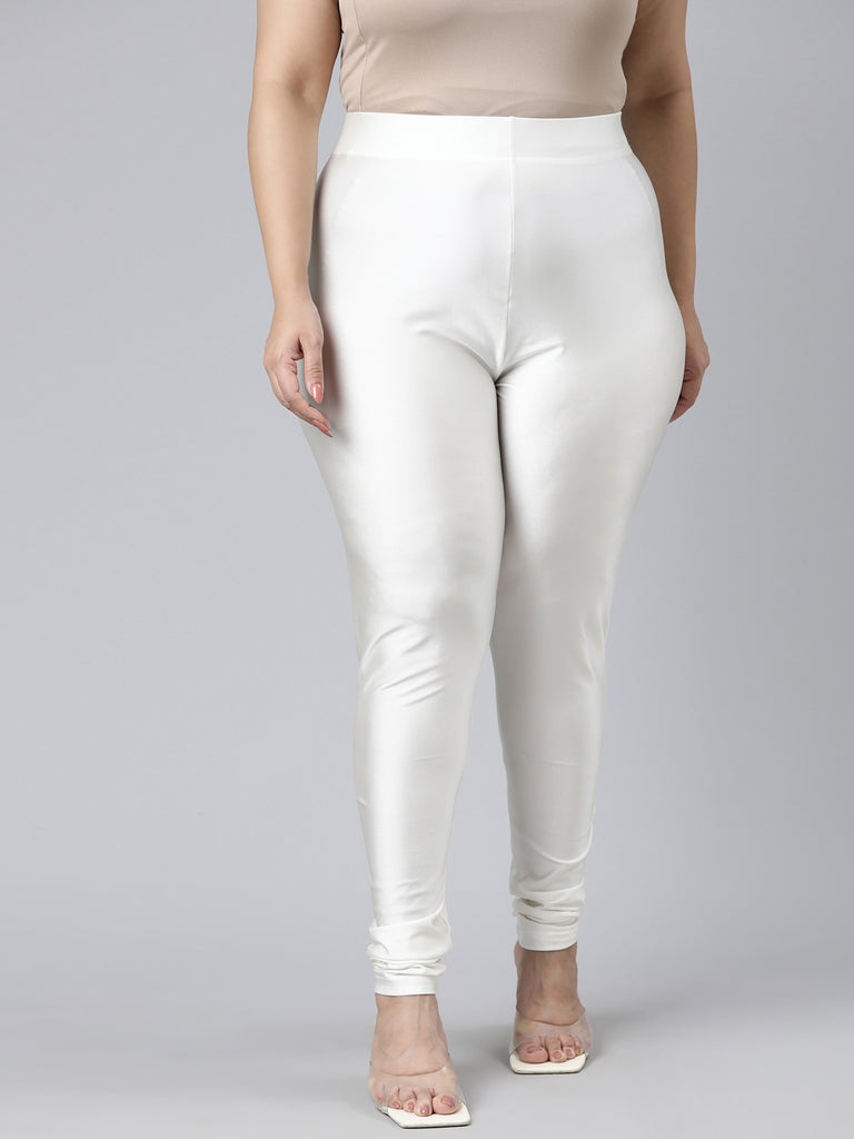 Go chic with a pair of White Solid Shimmer Churidar Leggings. Made from high quality Nylon & Elastane, it has a elasticised waistband & gathers at the hemline.